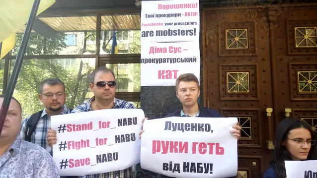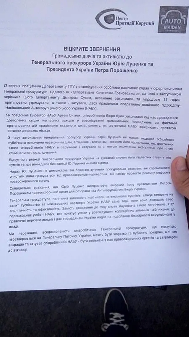 Кореспондент 24 Каналу повідомляє, що активісти принесли відкрите звернення генпрокуророві Юрію Луценкові та президенту Петрові Порошенку. У документі йдеться про те, що керівники одного з департаментів ГПУ на чолі з заступником керівника цього департаменту Дмитром Сусом незаконно затримали двох працівників НАБУ та упродовж 11 годин утримували їх та катували. Громадські діячі наголосили, що з цього часу генпрокурор жодного разу не виступив з офіційною заявою.