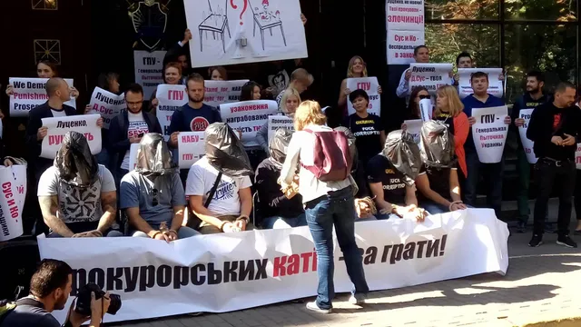 Активісти тримають плакати з написами: "Луценко, руки геть від НАБУ", "Діма Сус – прокурорський кат", "Прокурорських катів – за ґрати", "ГПУ – генеральная пыточная Украины". Деякі мітингувальники одягнули на голови мішки та зв'язали собі руки.