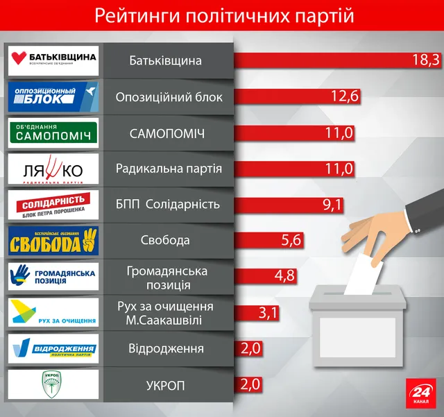 Зокрема, серед тих, хто має намір голосувати і вже визначився з вибором, лідирує ВО "Батьківщина" – 18,3%. 5-відсотковий виборчий бар'єр долають також "Опозиційний блок" (12,6%), "Об'єднання "Самопоміч" (11,0%), Радикальна партія (11,0%), Блок Петра Порошенка "Солідарність" (9,1%) та ВО "Свобода" (5,6%).