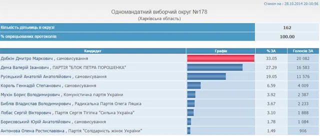 Про це свідчать дані ЦВК після проацювання 100% електронних протоколів на 179 окрузі.