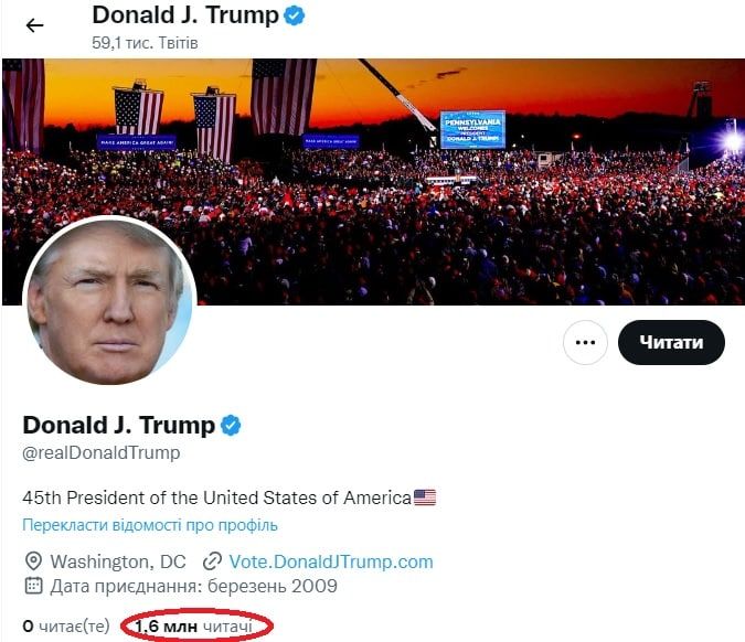 Додамо, що кількість підписників Трампа у твітері різко зростає. До розблокування їх було трохи більше за 320 тисяч, а менше, ніж за годину після розблокування – вже понад 1,6 мільйона.