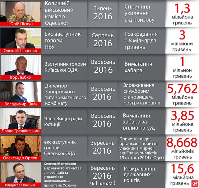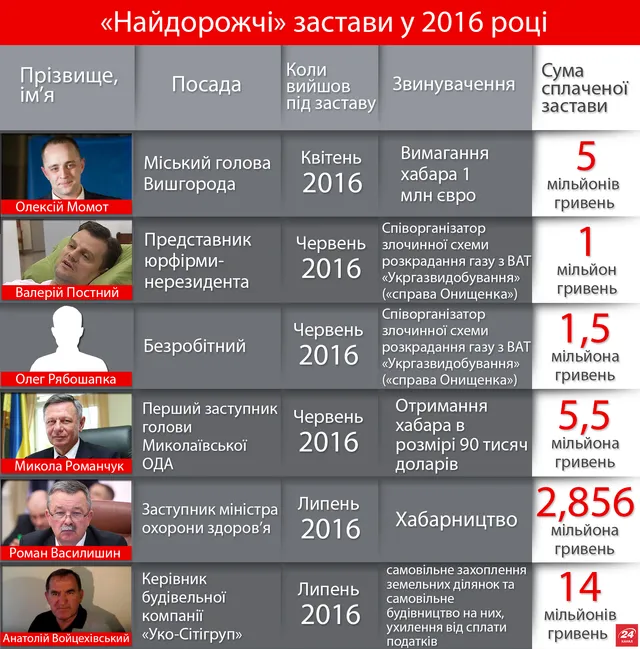Це вже не перший випадок цього року, коли чинні чи колишні високопосадовці або й "прості безробітні" платять мільйонні суми, аби вийти на волю до озвучення вироку. Журналісти сайту "24" виділили найгучніші сплати застави у 2016 році.
