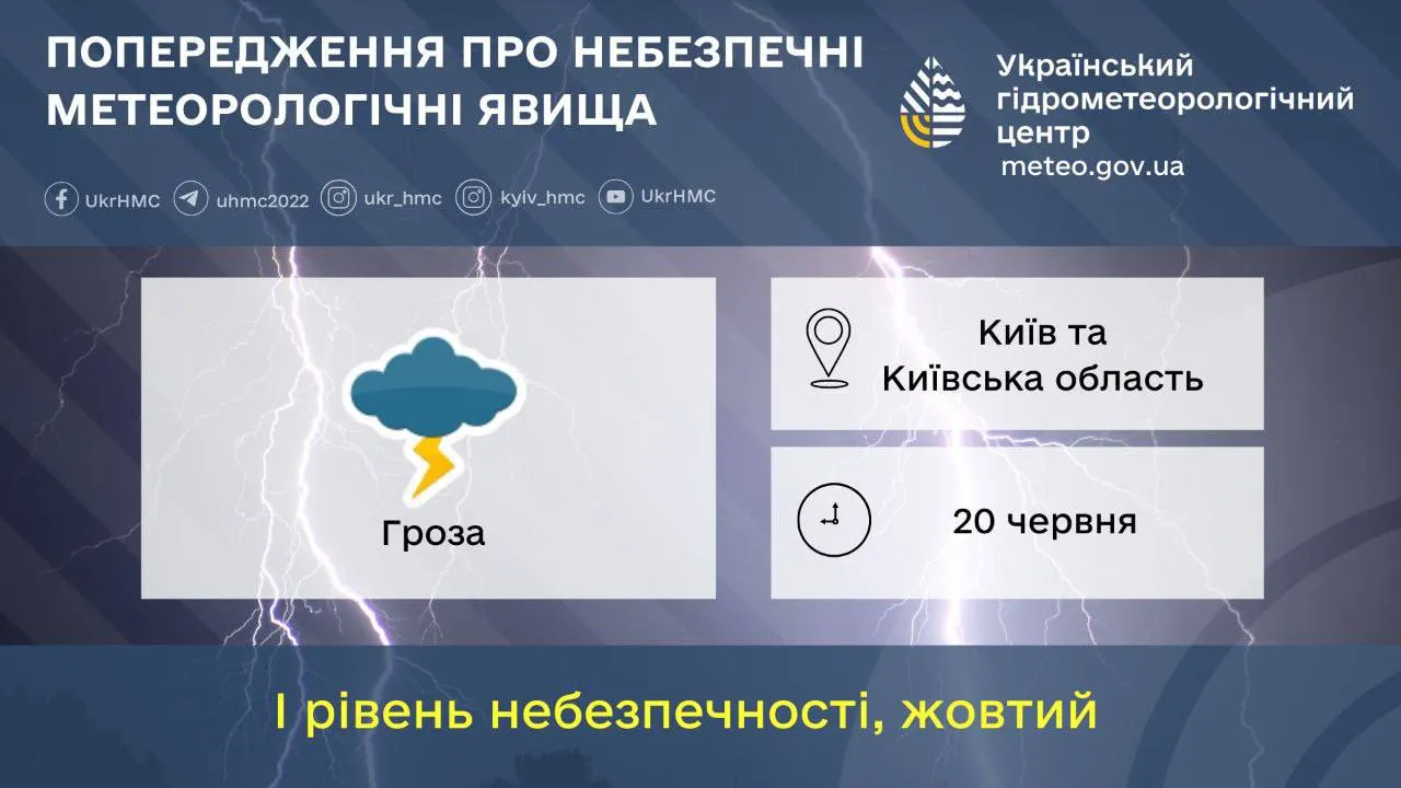 Метеорологи попереджають, що вже зранку з утриманням до кінця доби 20 червня, у Києві та області очікуються сильні пориви вітру 15 – 20 метрів на секунду. Прогнозується мінлива хмарність з короткочасним дощем, грозою.