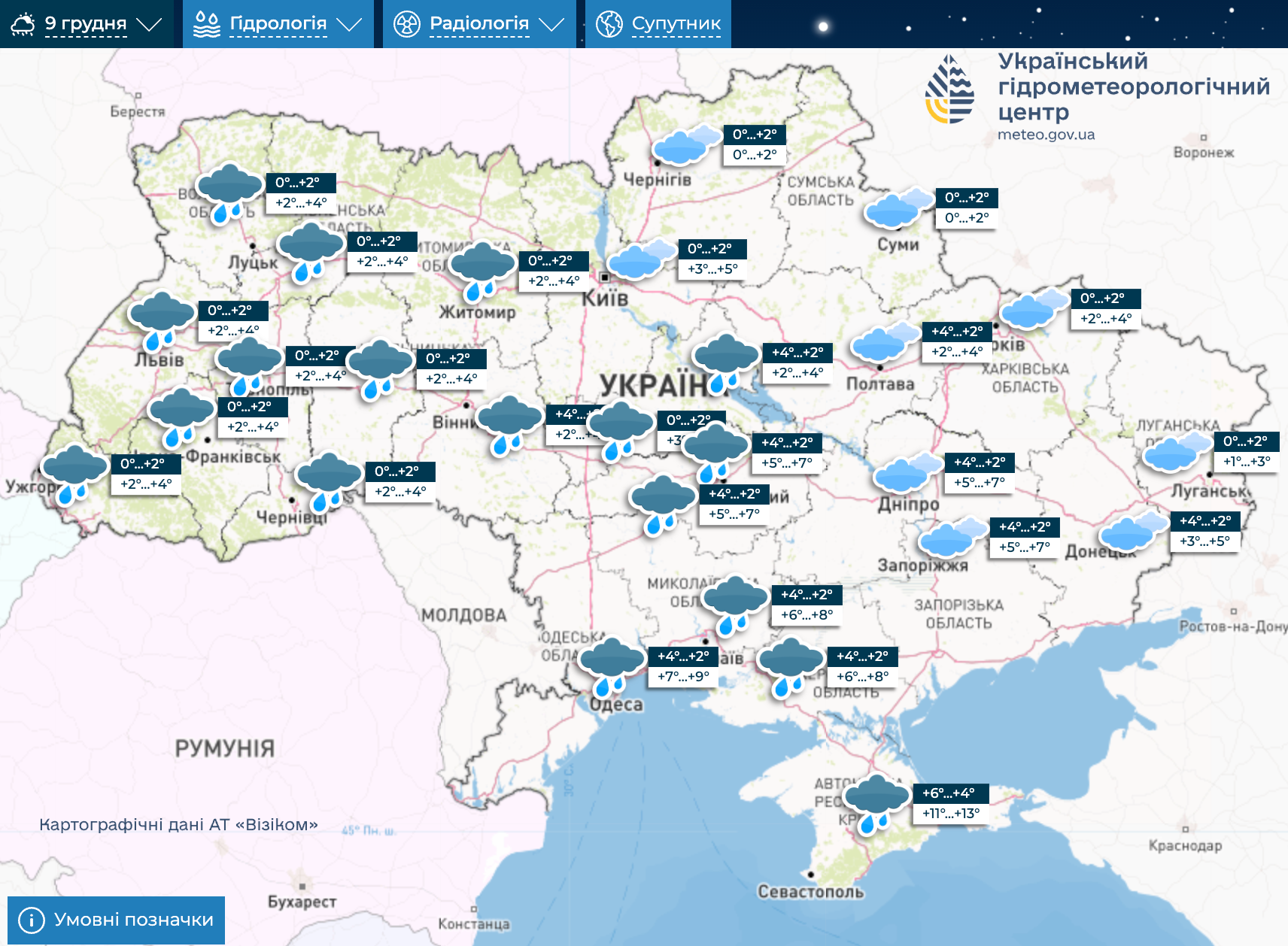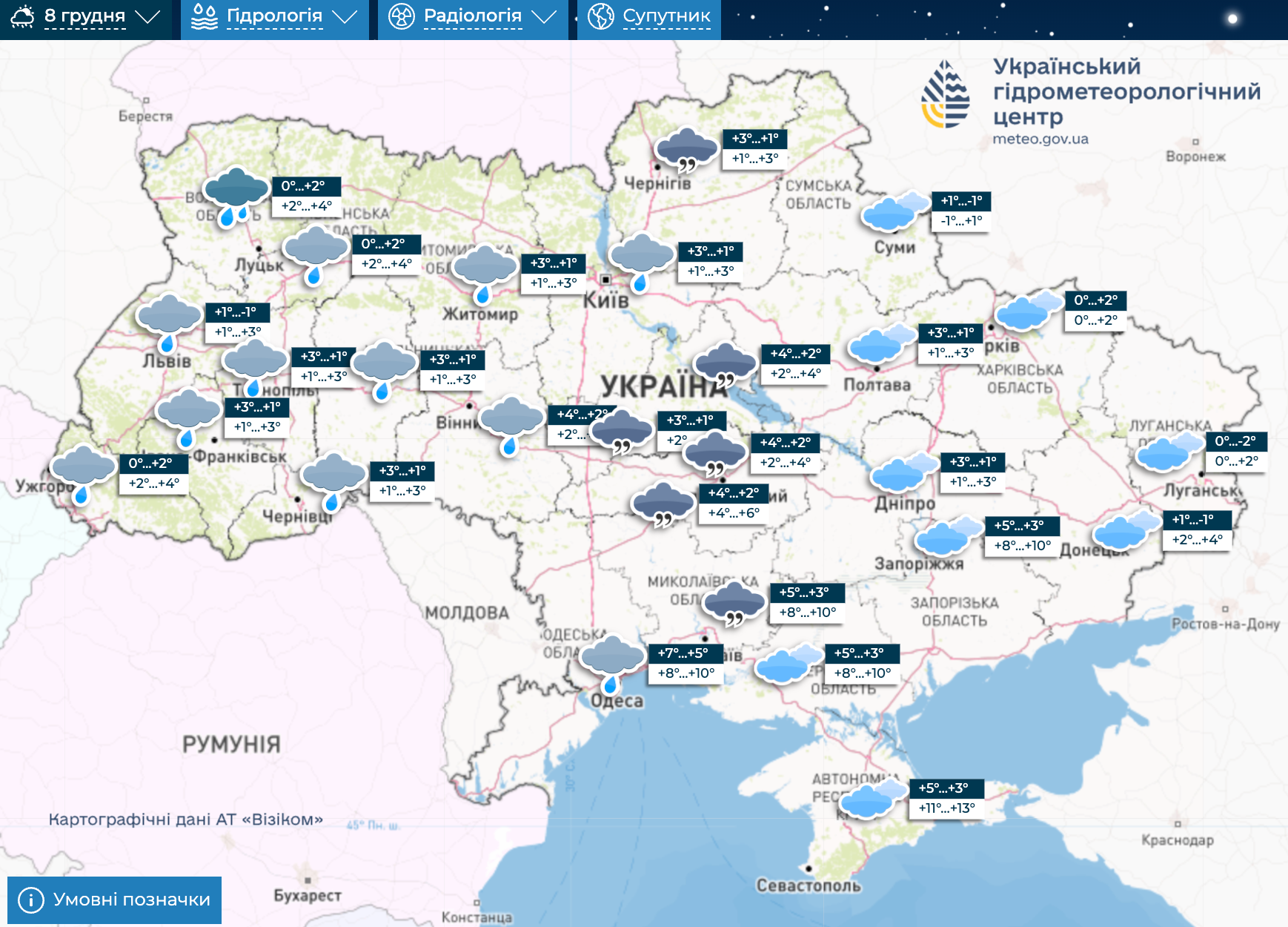 За прогнозом синоптиків, 8 грудня на Правобережжі, 9-го в західних, вдень і в більшості південних і центральних областей йтимуть дощі. На Заході також очікується мокрий сніг. Тим часом на решті території України без опадів.