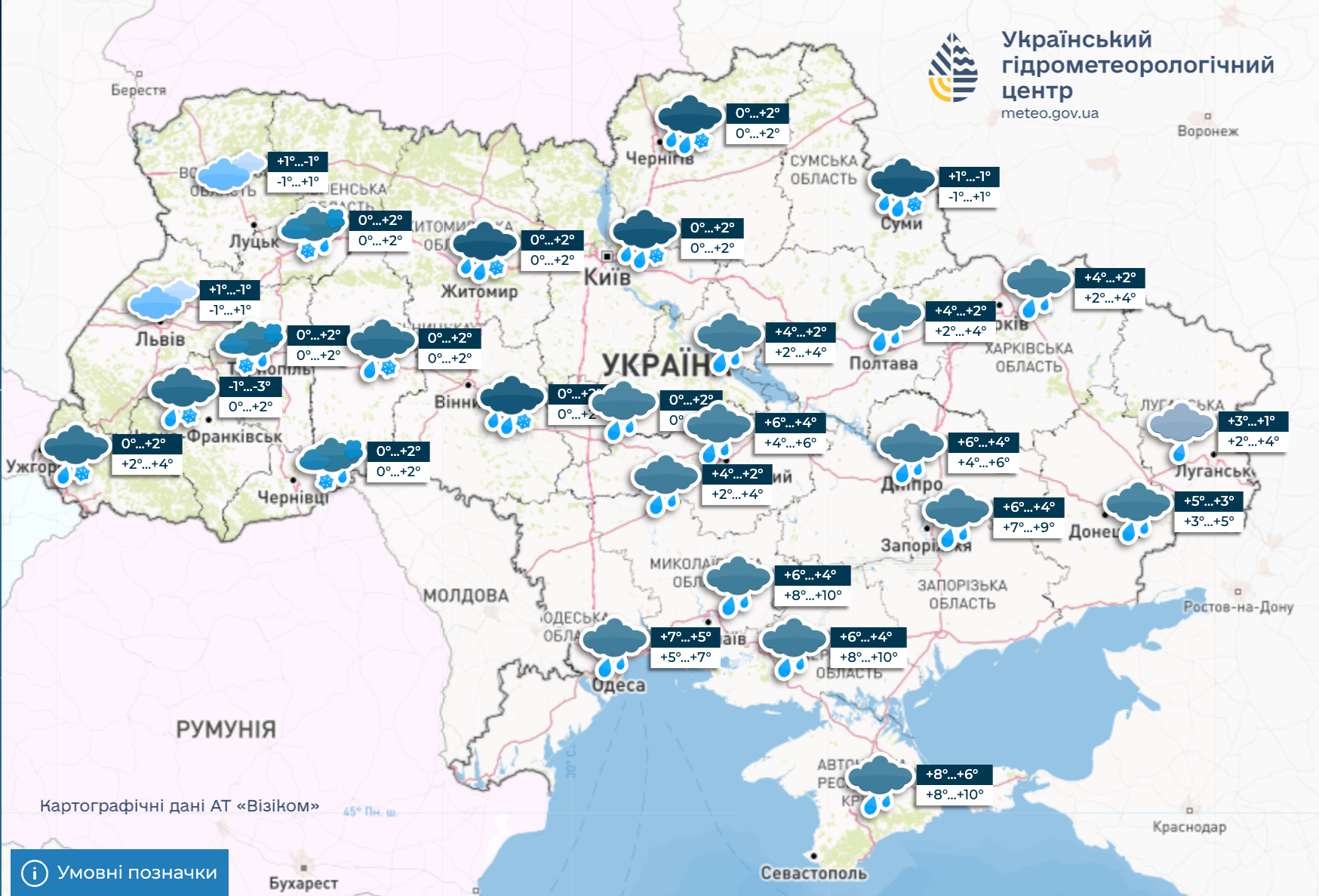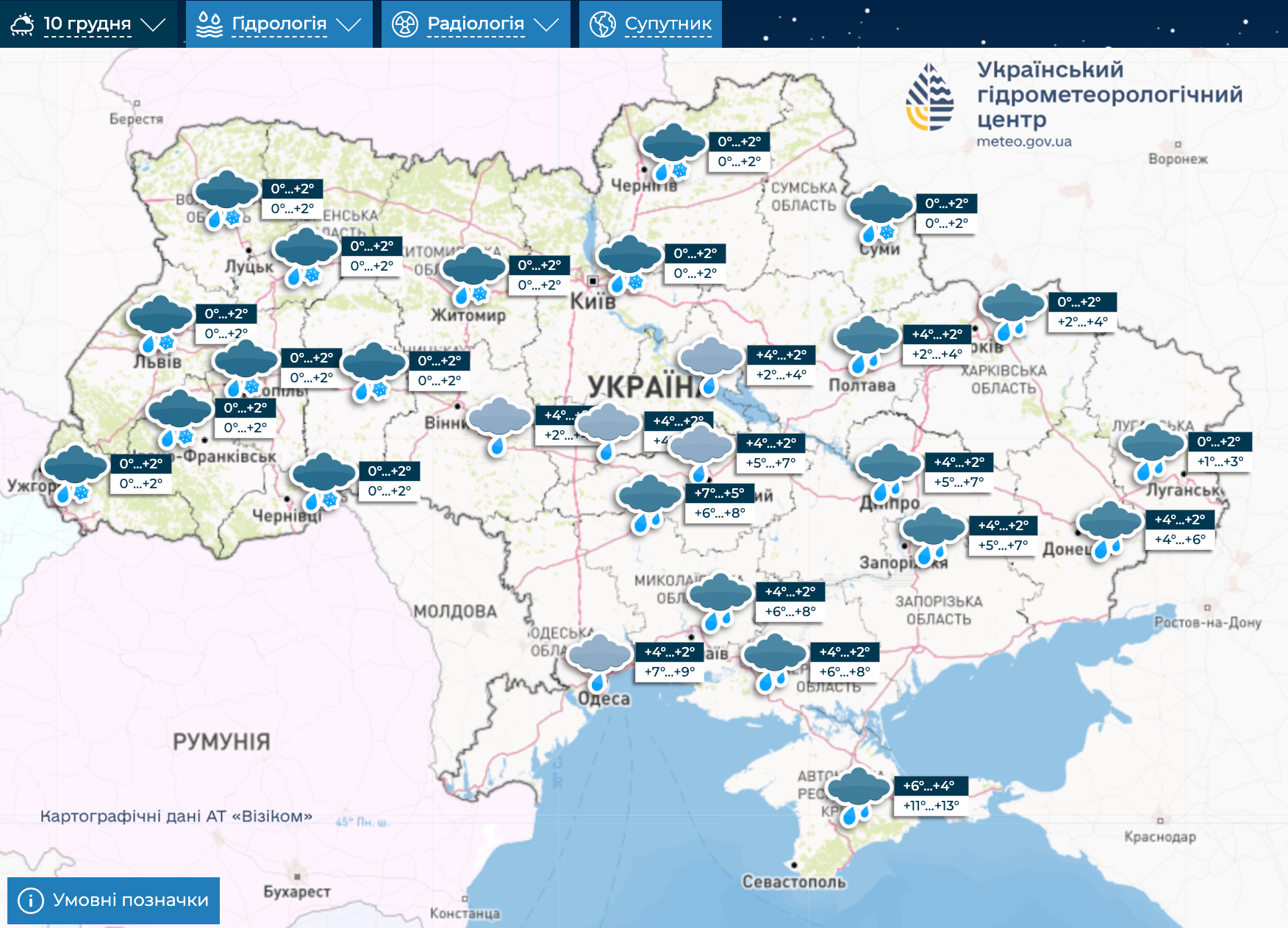 10 грудня в більшості областей опади переважно у вигляді дощу, на Півночі та Заході з мокрим снігом,