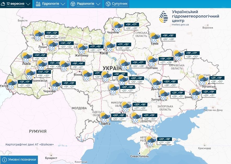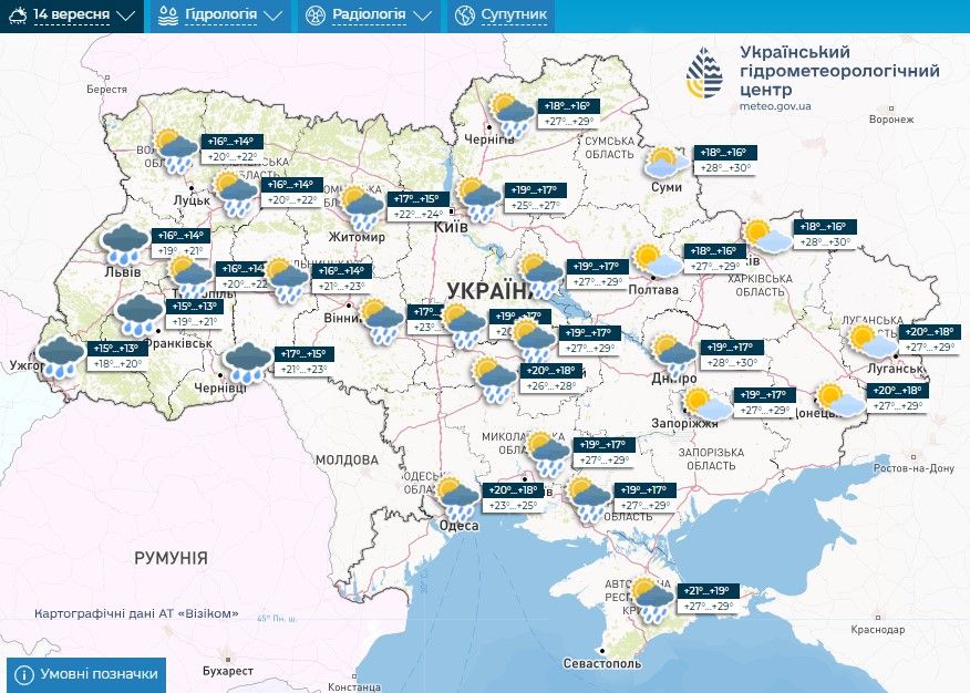 Вдень +24 – +29, однак, у більшості західних областей +17 – +23 градуси. Лише 11 – 12 вересня на Сході та Півдні до +32 градусів.
