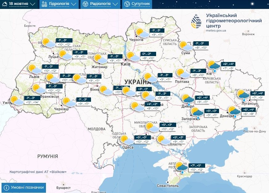 - В Укргідрометцентрі попереджали, що вночі 18 жовтня у західних, північних і центральних областях (крім Дніпропетровської) сильні заморозки в повітрі 0 – -3 градуси. В Одеській та Миколаївській – заморозки на поверхні ґрунту 0 – -3 градуси.