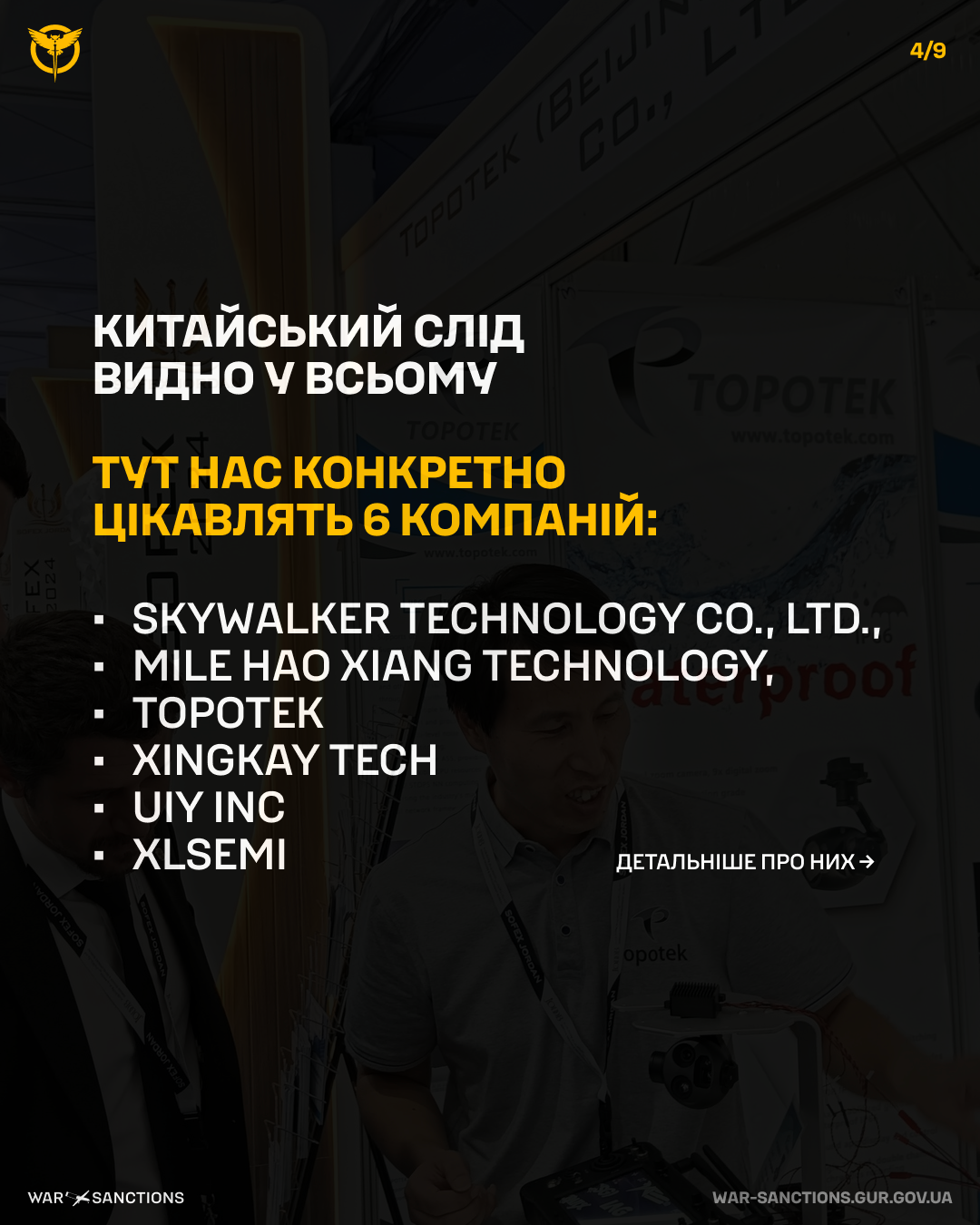 - Xingkay Tech – виробляє камеру Topotek KHY10S90 та модем Xingkai Tech Mesh Network XK-F358, якими оснащений дрон;