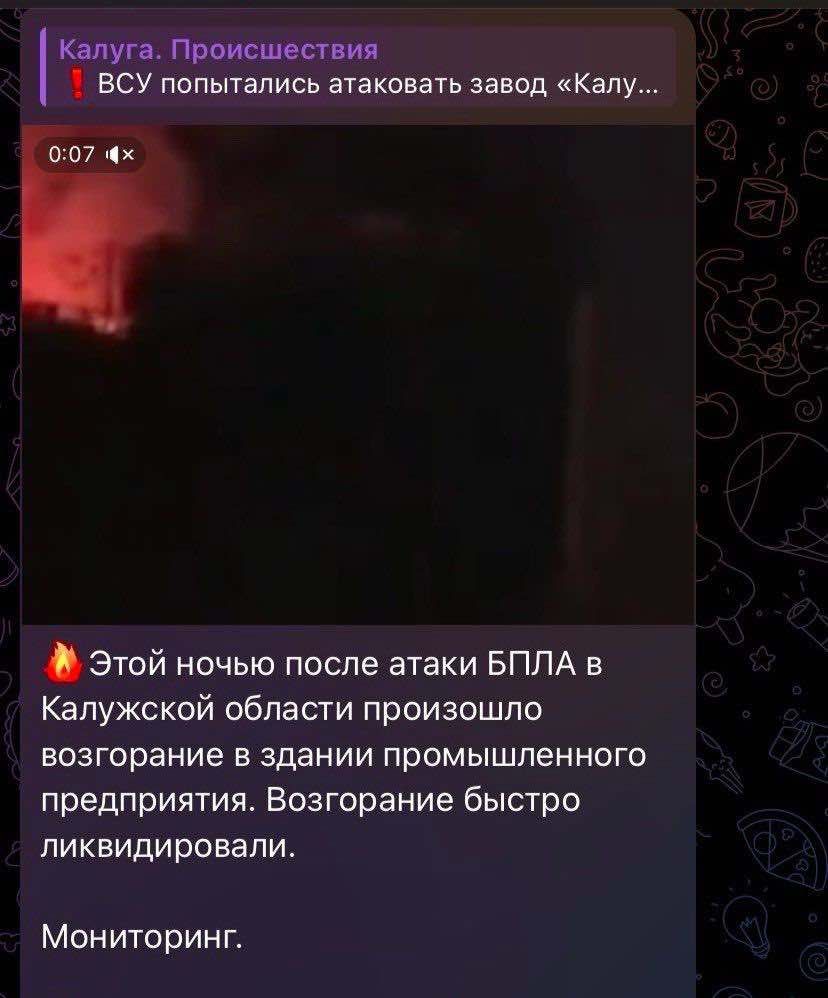Калузькі телеграм-канали разом з поширенням відео з місця події повідомили про падіння уламків та пожежу в "будівлях промислового підприємства".