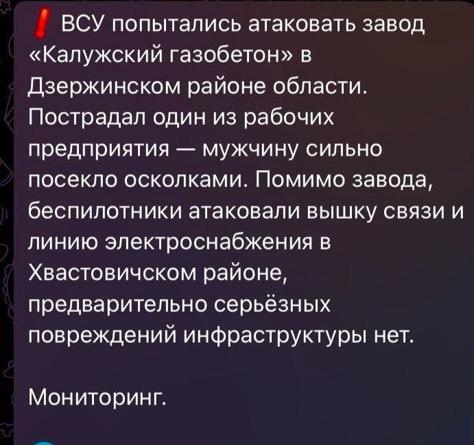 Крім того, губернатор Калузької області вранці підтвердив нічну атаку безпілотників на регіон, влучання у промислове підприємство, інфраструктурний об'єкт зв'язку та енергетики. Однак інших деталей не розкривав.