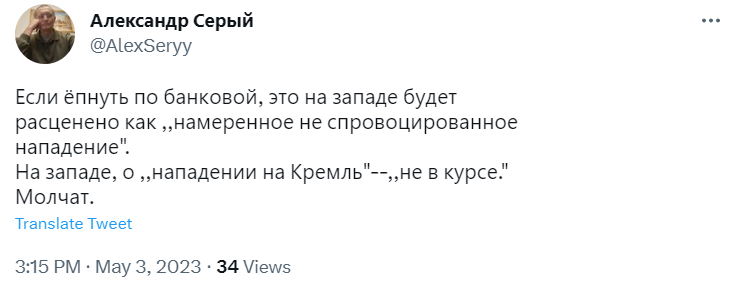 - "Якщо йо*нути по Банковій, це на Заході буде розцінено як "навмисний та не спровокований напад”. На Заході про "напад на Кремль" не в курсі. Мовчать"