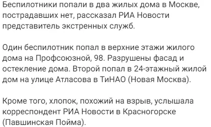 Мер того, що поки називається російською столицею, майже одразу визнав той факт, що Білокам'яна перебуває під нальотом, а після нього про інциденти почали писати всі інші псевдоЗМІ. Щоправда, ніхто не міг визначитися, чи то стався вибух, схожий на хлопок, чи навпаки. Схилялися здебільшого до хлопка, аби ні в кого не сталося враження, що у Росії щось пішло не так.