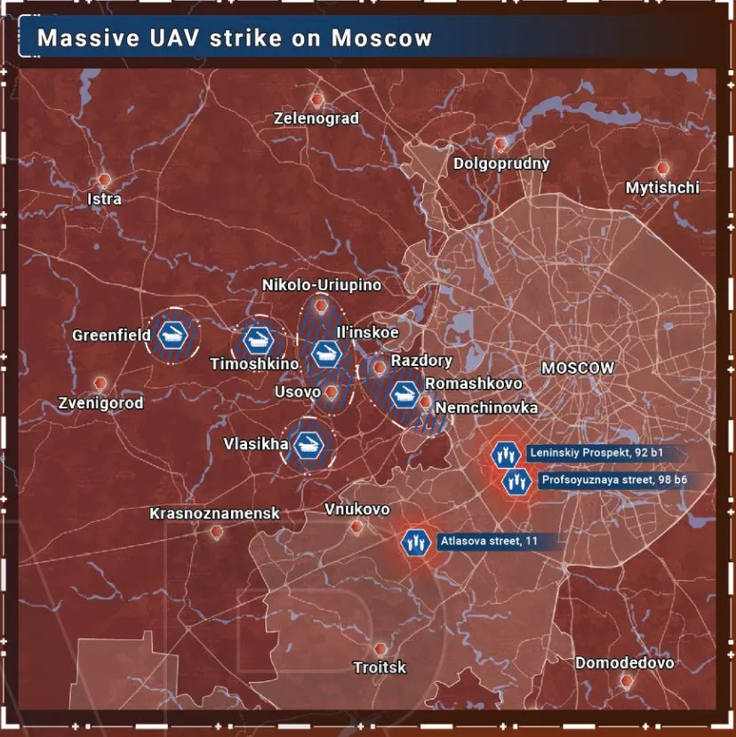 Карта атаки БпЛА по Москві показує, що насправді захищає Путін / Скриншот з твіттеру War Monitor