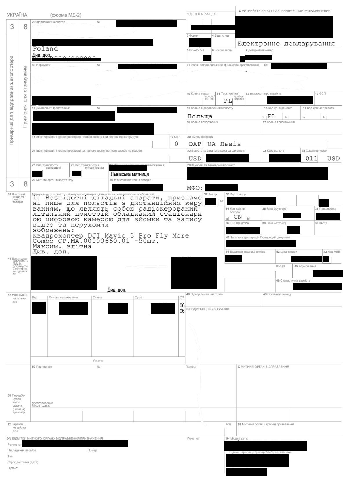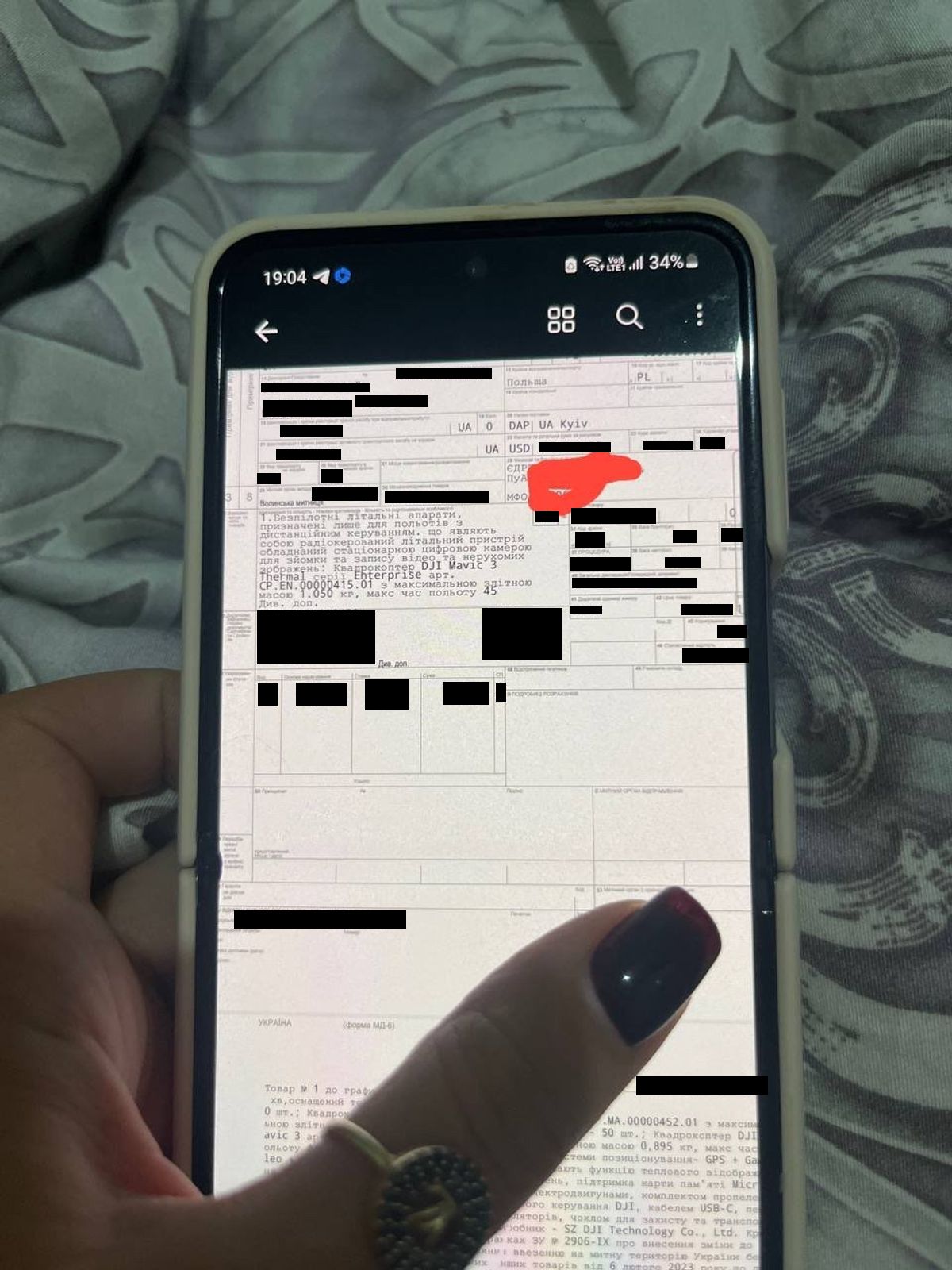 - Щонайменше дві митні декларації, у яких йдеться про різні партії дронів, що були на кордоні. Ці документи є справжніми, але контрагенти, зазначені в них, не мають жодного стосунку ні до Матякіної, ні до Приступи, тому є підстави припускати, що надали волонтерам їх для того, аби замилити очі.