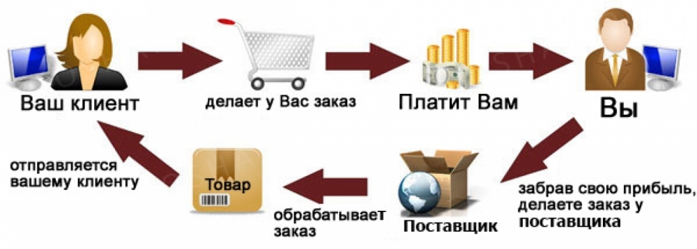 Людині, що займається дропшипінгом, не потрібно зберігати товари на складі. Вона замовляє їх у постачальника в міру укладання угоди, передаючи йому дані та адресу покупця. Далі виробник продукції відправляє замовлення прямо клієнтові. В результаті посередник отримує прибуток, який становить різницю між оптовою ціною товару і роздрібною. Бажано, щоб вона мала розмір від 30% і вище. В цьому випадку дропшипер забезпечить собі непоганий заробіток, приділяючи увагу виключно пошуку клієнтів і укладанню угод із ними.