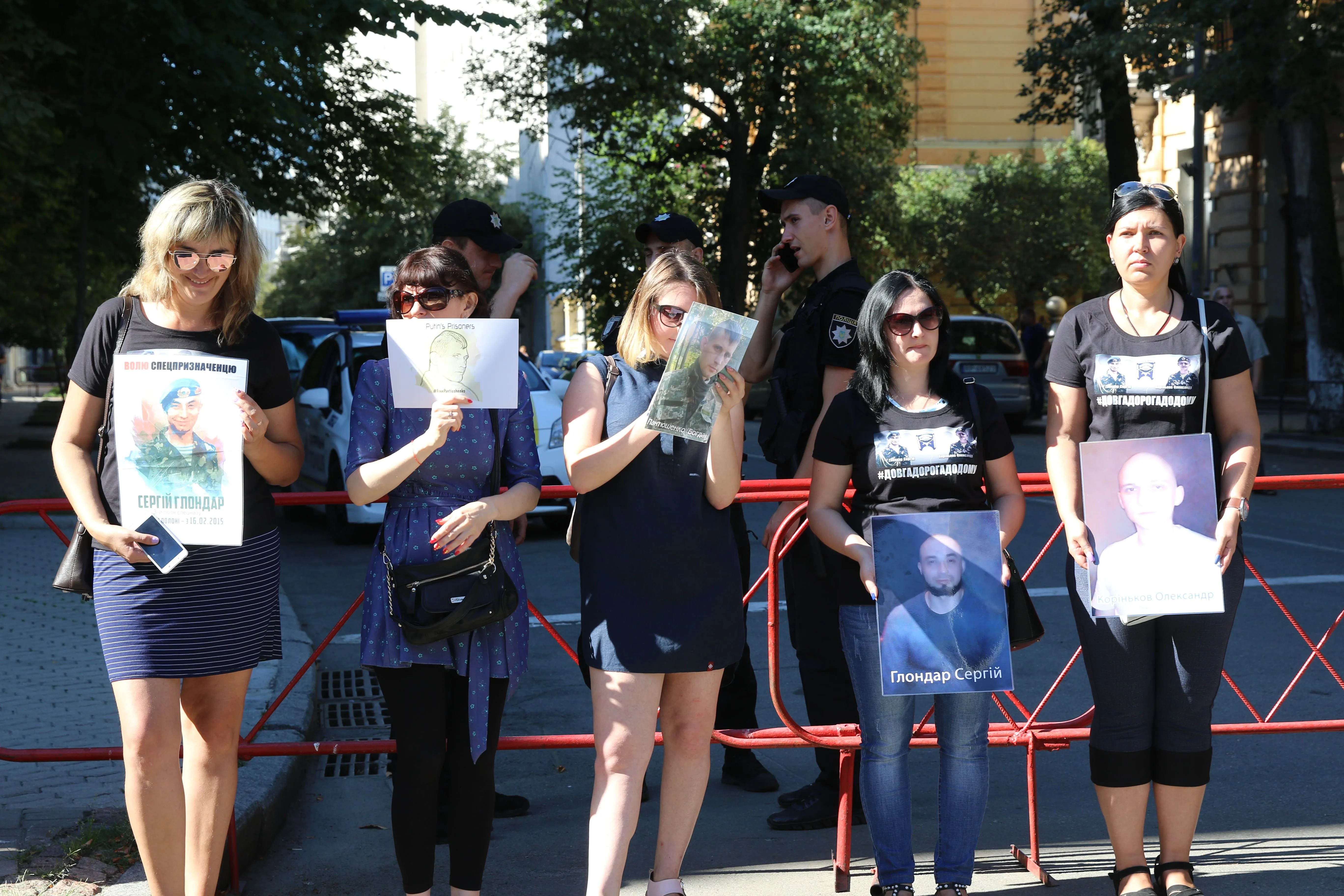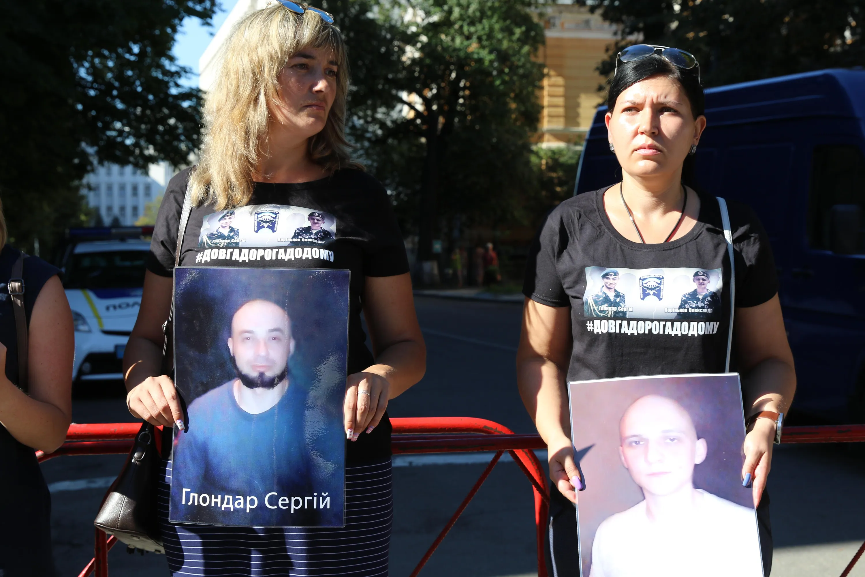 Зокрема, дружини і сестри десантників Сергія Глондаря і Олександра Корінькова та танкіста Богдана Пантюшенка, які потрапили у полон під час виконання бойового завдання та нині перебувають у Донецькому СІЗО суворого утримання, вийшли з плакатами під Адміністрацію Президента нагадати, що їх рідні мають бути на волі.