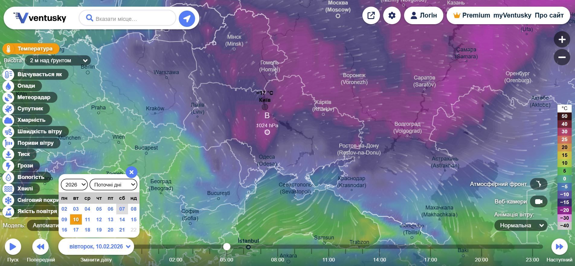 Дані про погоду в Україні зранку 10 лютого 2026 на порталі Ventusky / Скриншот 24 Каналу