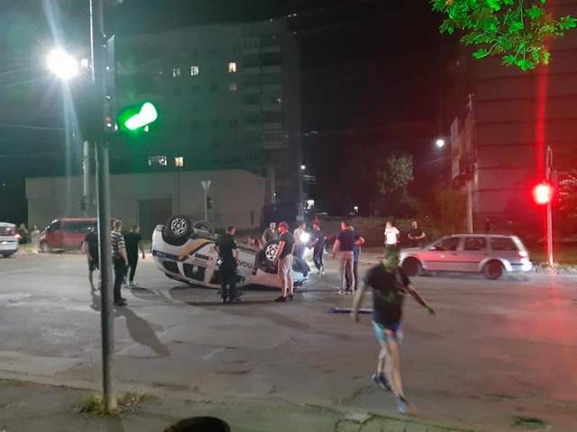 Потім транспорт різко звернув. Після цього 2 автомобілі зіткнулися. Відтак службове авто поліції перекинулось посеред дороги.