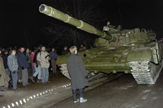 Росіяни блокують танки, які вивели на вулиці члени так званого "ГКЧП" (ДКНС – Державного Комітету з Надзвичайного Стану). Фото з відкритих джерел.