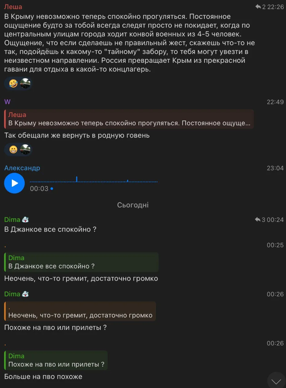 У місцевих чатах люди не боялися обговорювати, що саме відбувалося у місті. Хтось казав, що працює "расійская ПЕВЕО", а інші не могли зрозуміти, чи був у Джанкої приліт.