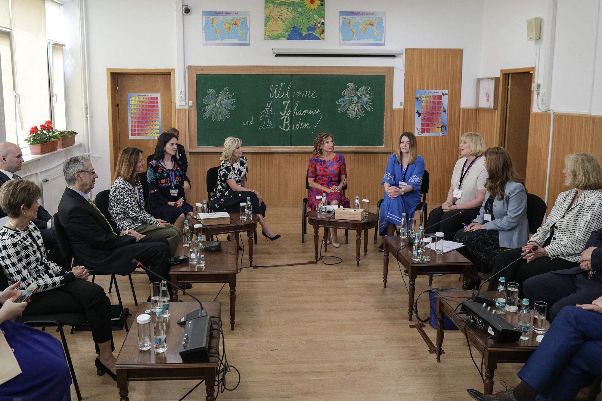 Джилл Байден супроводжувала перша леді Румунії Кармен Йоганніс. Вони відвідали школу Uruguay у Бухаресті.