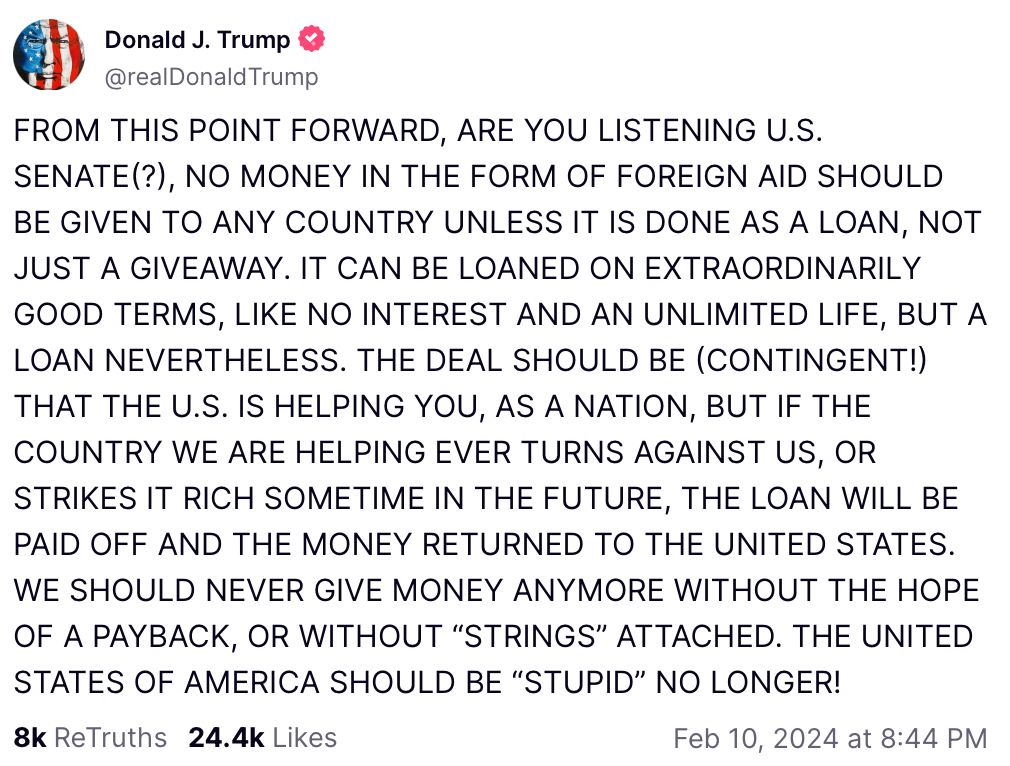 Пост чинного президента США щодо грошової допомоги іншим країнам / Скриншот з акаунту Трампа у соцмережі Truth Social