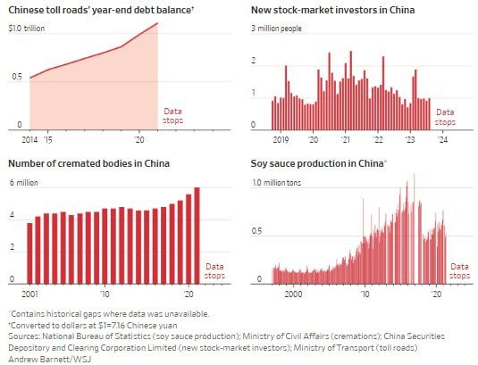 У Китаї від громадян приховують важливі дані, як-от статистику кремацій, виробництво соєвого соусу чи кількість інвесторів на фондовому ринку. Наприклад, у 2021–2022 роках спостерігався сплеск активності нових інвесторів, а з 2023 року дані не публікують / Інфографіка The Wall Street Journal