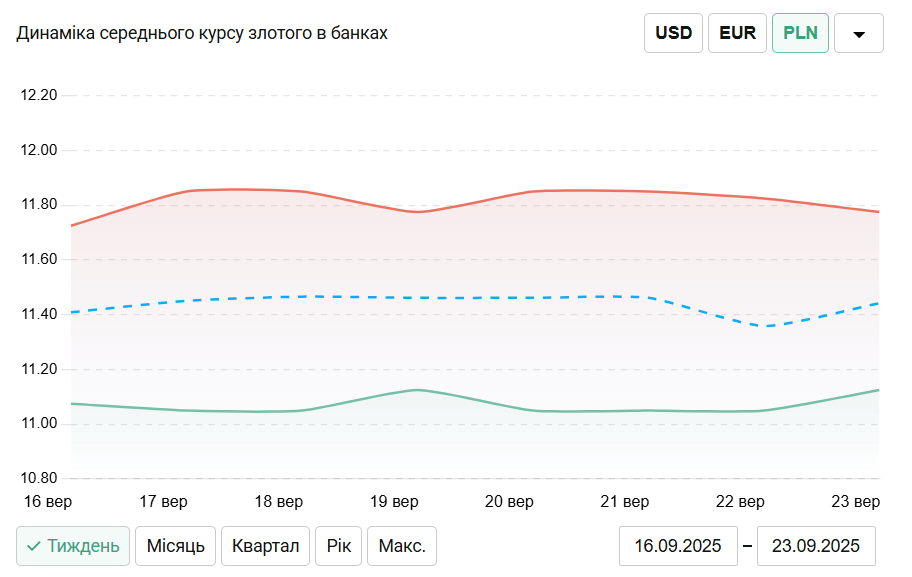 - купівля – 11,39 гривні за злотий (+3 копійки порівняно з 22 вересня);