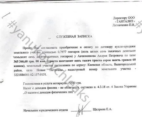 У службовій записці на ім’я директора ТОВ "Танталіт" Павла Ливточенка керівник юридичного відділу Щедріна Е.А. просить погодити придбання і оплату земельної ділянки площею 0,7977 га у Авчіннікова Андрія Петровича.