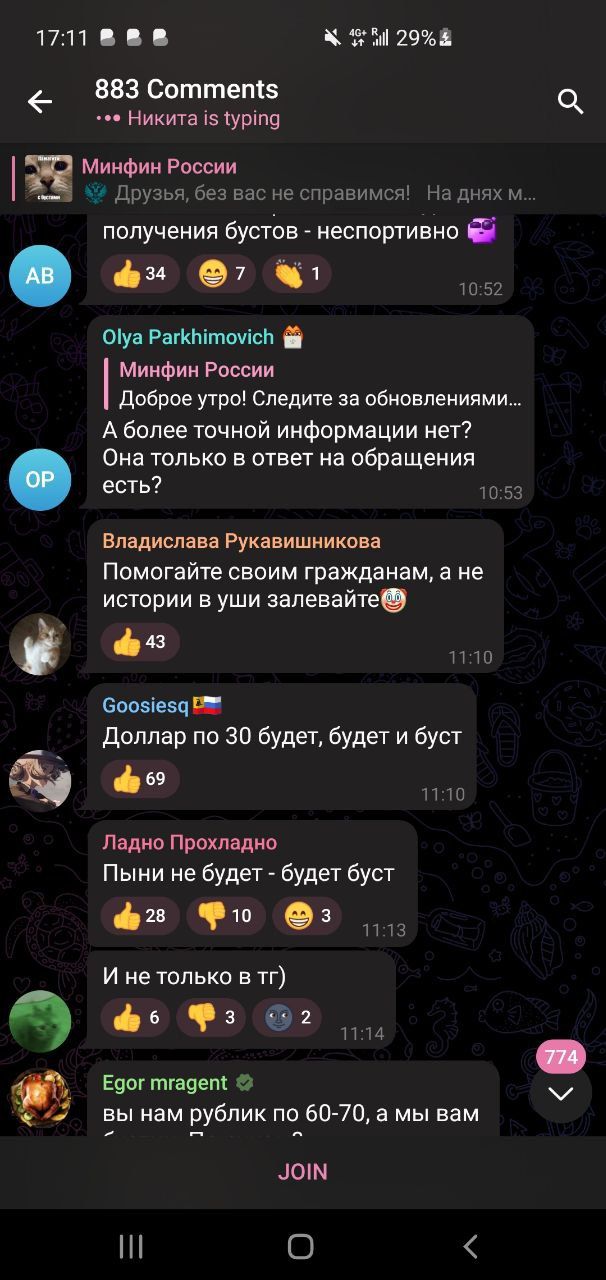 Росіяни у відповідь висміяли Мінфін та порадили відомству "забустити" економіку держави-терориста. Жителі Росії у коментарях також почали жалітися через поганий курс рубля. Одні вимагали "долар по 30", інші ж розуміли, що такого курсу ніколи не вже не буде та просили зробити хоча б "долар по 70".