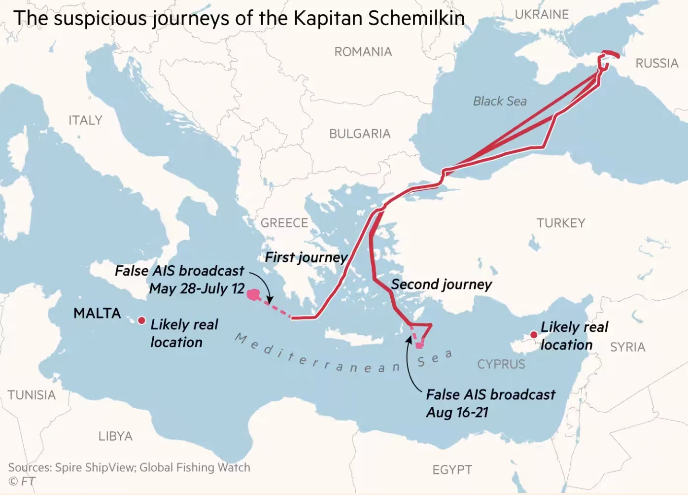 GFW також з’ясував, що коли корабель стверджував, що пливе від Греції, його сигнали інколи вловлювали телекомунікаційні супутники не в тій частині Середземного моря. У різні моменти подорожі "Капітан Щемілкін" також повідомляв інші судна через AIS, що прямує до Мальти та Північного Кіпру.