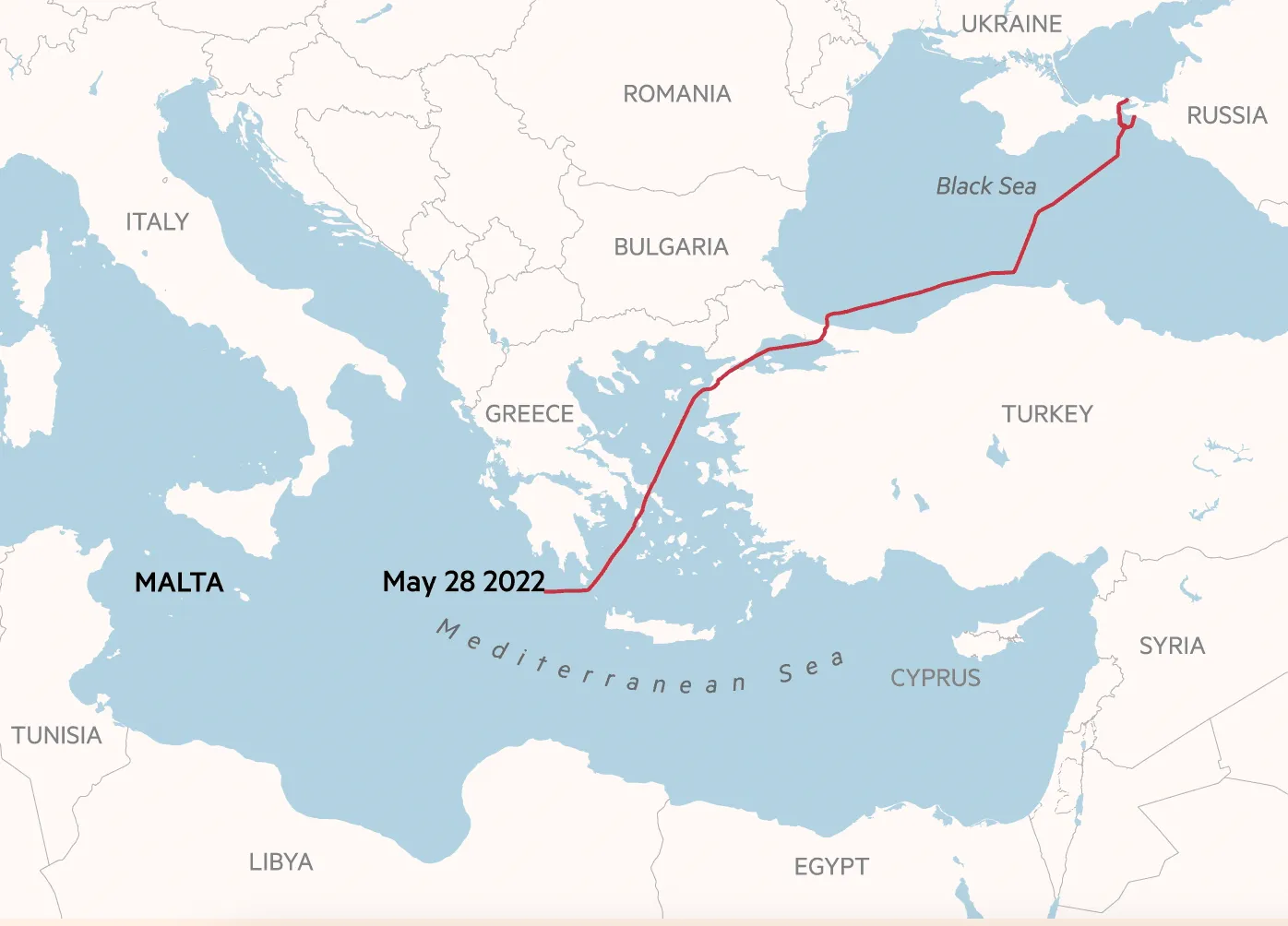 Судно вперше відвідало морський причал поблизу Мальти з травня по липень, а через місяць відвідало електростанцію Teknecik на Північному Кіпрі, згідно з висновками аналітиків. В обох випадках танкер транслював помилкові позиції через транспондер системи автоматичної ідентифікації (AIS) — пристрій безпеки, який безперервно транслює позицію судна, показуючи, що воно пливе по колу в грецьких водах.