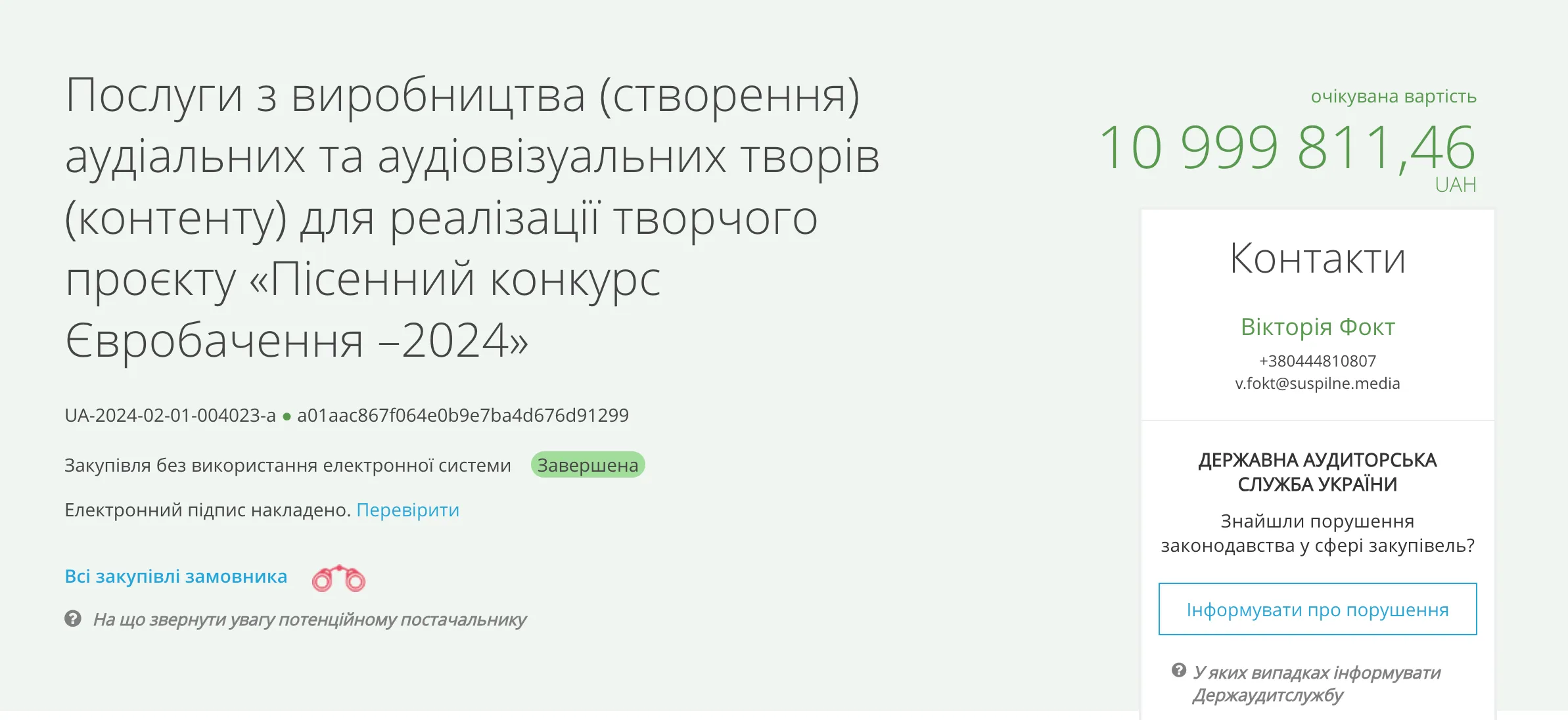 На сайті ProZorro зазначено, що вечірнє телевізійне шоу під назвою "Національний відбір на Євробачення-2024" вартувало 10 999 811,46 гривні. Усі ці гроші будуть сплачені із державного бюджету України.