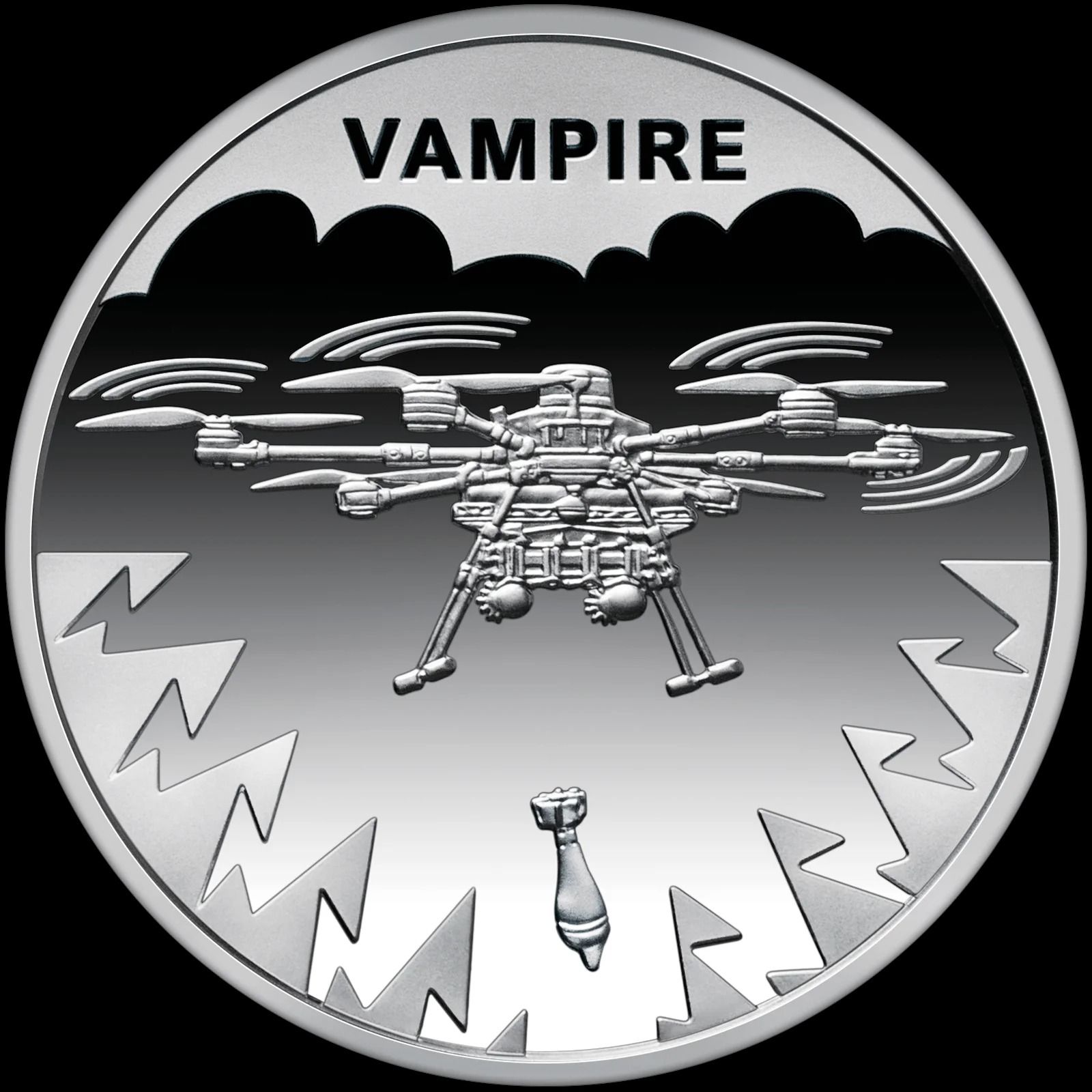 На зворотному боці монети (реверсі) зображений сам безпілотник Vampire на фоні хмари з блискавками. Дрон у польоті скидає боєприпаси. У верхній частині розмішено назву гексакоптера.