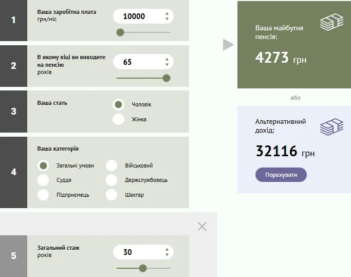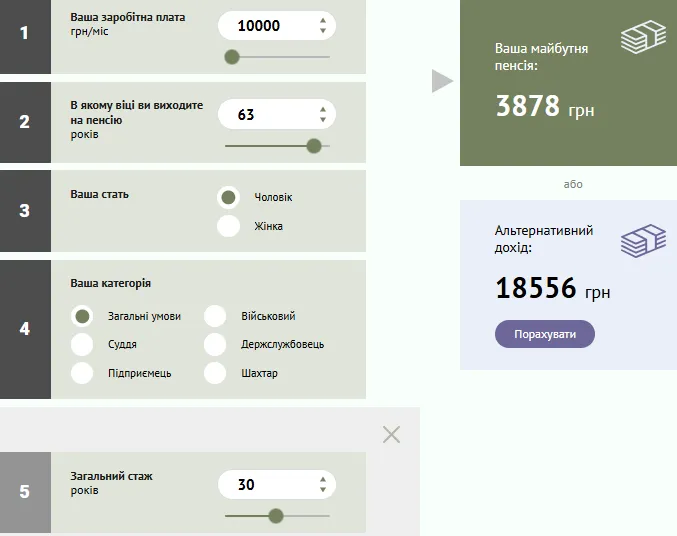 Яка буде пенсія при стажі 30 років в 65 / Скриншот Пенсійний калькулятор