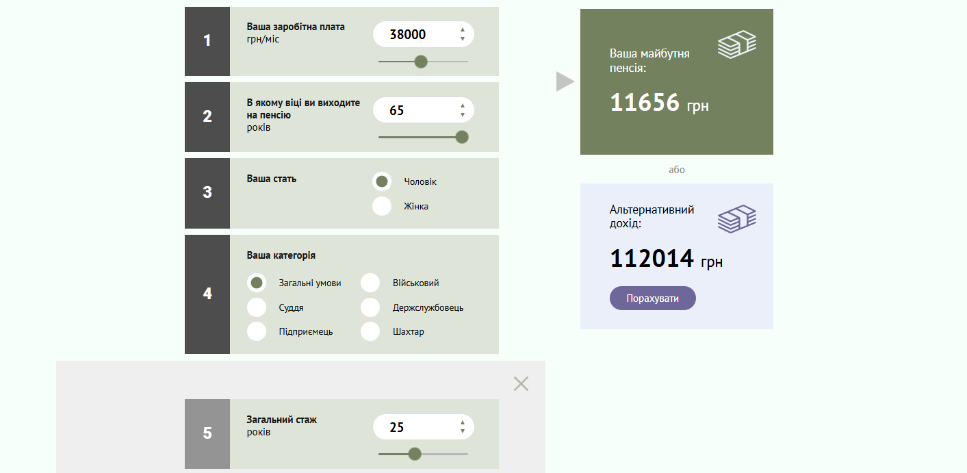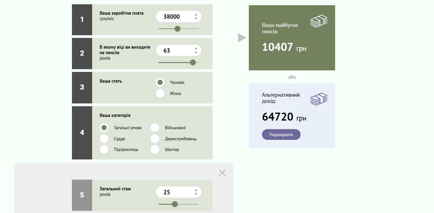 Яка буде пенсія при зарплаті 38 000 гривень зі стажем 25 років у 63 роки / Скріншот із пенсійного калькулятора