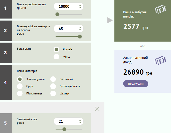 Яка пенсія при стажі 21 рік і доході 10 тисяч / Скриншот пенсійний калькулятор