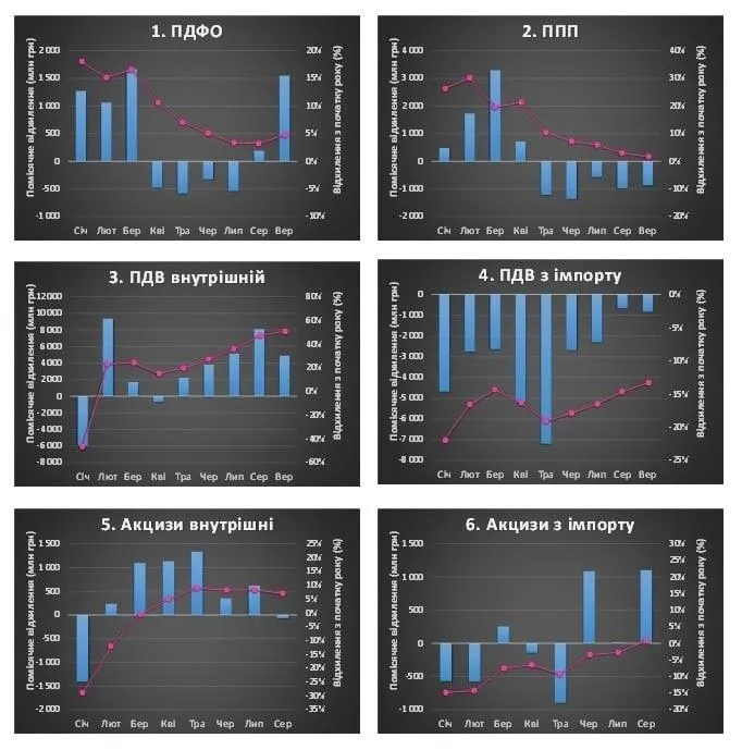 "За час, починаючи з травня, є тільки два досягнення – безпрецедентні збори внутрішнього ПДВ (ми не коментуємо, за рахунок чого), а також підтягування ПДФО у вересні шляхом збільшення мінімальної зарплати. Помісячні надходження податку на прибуток підприємств й імпортного ПДВ – надалі у важких мінусах. Це зрозумілий біль, враховуючи ковідну кризу, але точно не підстава для будь-якої бравади", – зазначив експерт на своїй сторінці в мережі Facebook, коментуючи дані графіка податкових надходжень.