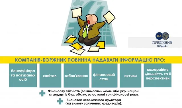 Боржник своєчасно має надавати кредиторам та інвесторам доступ до інформації про свій фінансовий стан, активи, капітал, зобов’язання, комерційну діяльність та її перспективи, інформацію про бенефіціарного власника та пов’язаних осіб. Також компанія подає фінансову звітність, яка повинна відповідати вимогам міжнародних стандартів або українським національним стандартам бухгалтерського обліку, за останні три фінансові роки, а також висновок незалежного аудитора, про який згадувалося вище.