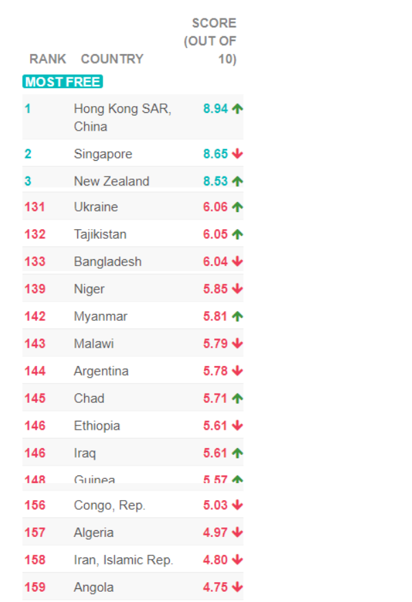 Уже традиційно, всесвітній рейтинг економічної свободи очолили Гонконг і Сингапур. Цікаво, що Польща до 2004 року знаходилася в третій групі, після чого піднялася до рівня переважно вільних країн, де й перебуває і зараз. Водночас позиції країни цього року погіршилися, і вона опустилася з 59 на 77 місце в рейтингу.