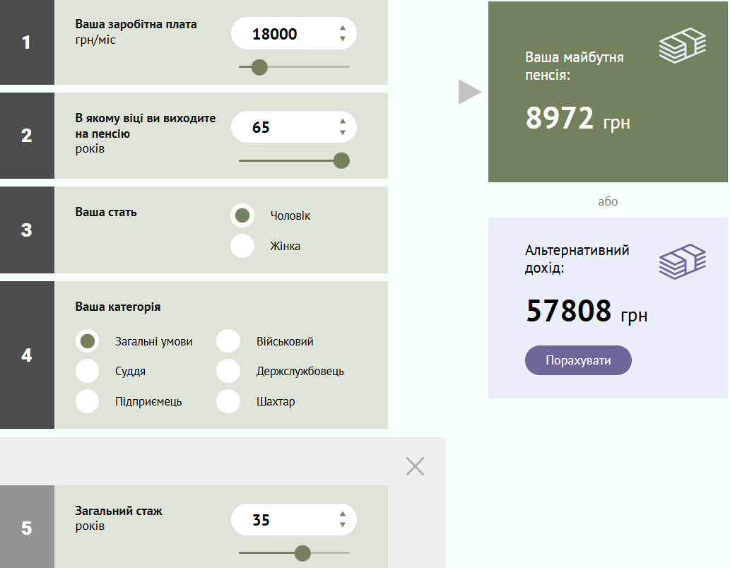 Якою буде пенсія при зарплаті 18 тисяч та стажі 35 років / Скриншот пенсійного калькулятора