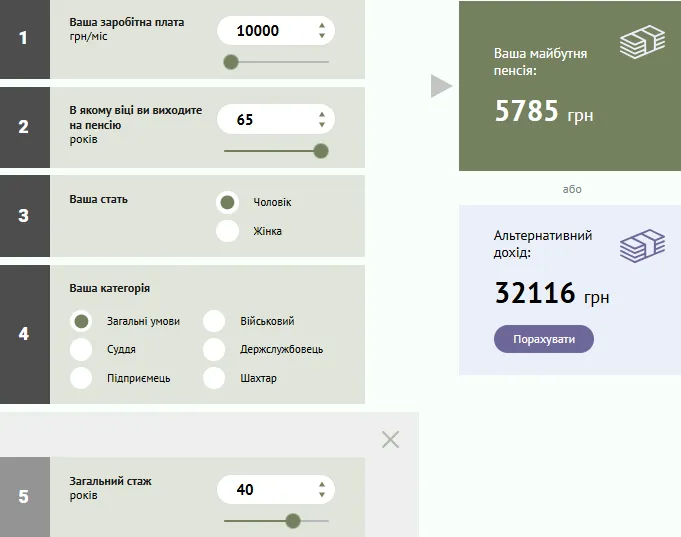 Яка буде пенсія, якщо працював 40 років / Скриншот пенсійний калькулятор