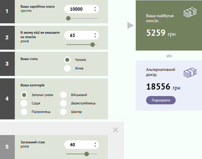 Яка буде пенсія в 63, якщо маєш стажу 40 років / Скриншот пенсійний калькулятор
