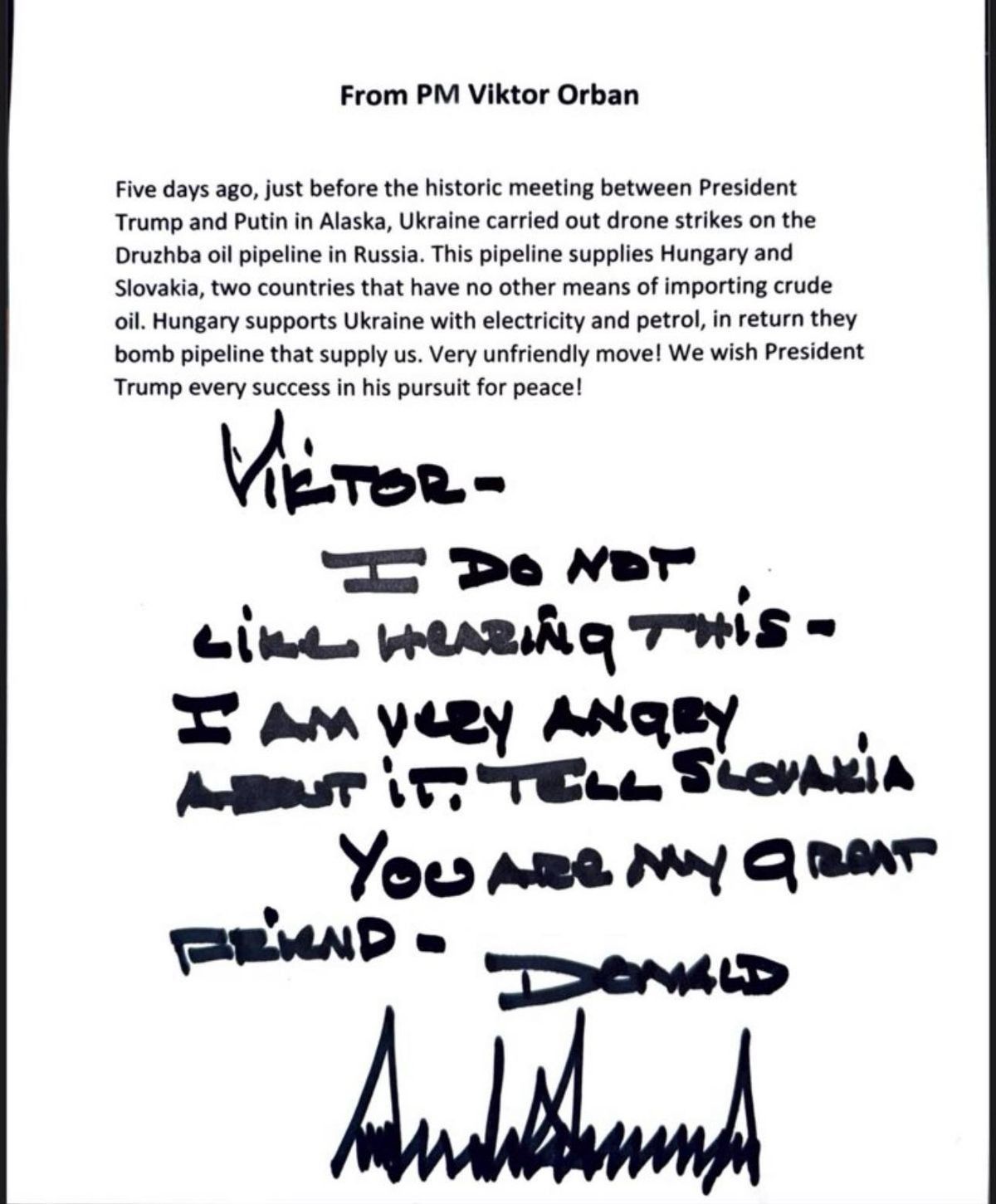 – написал Трамп от руки на письме Орбана.