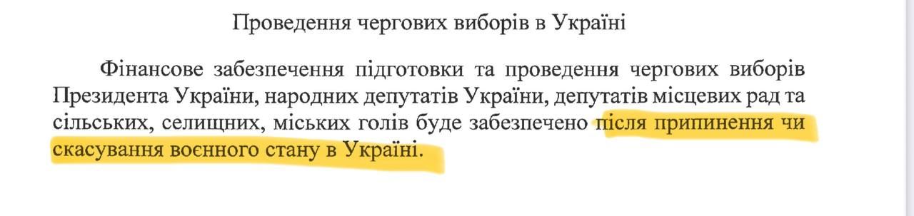 Финансирование выборов предполагается "после прекращения и отмены военного положения в Украине". Ну как минимум такой абзац правительство заложило в Бюджетную декларацию 2026-2028,