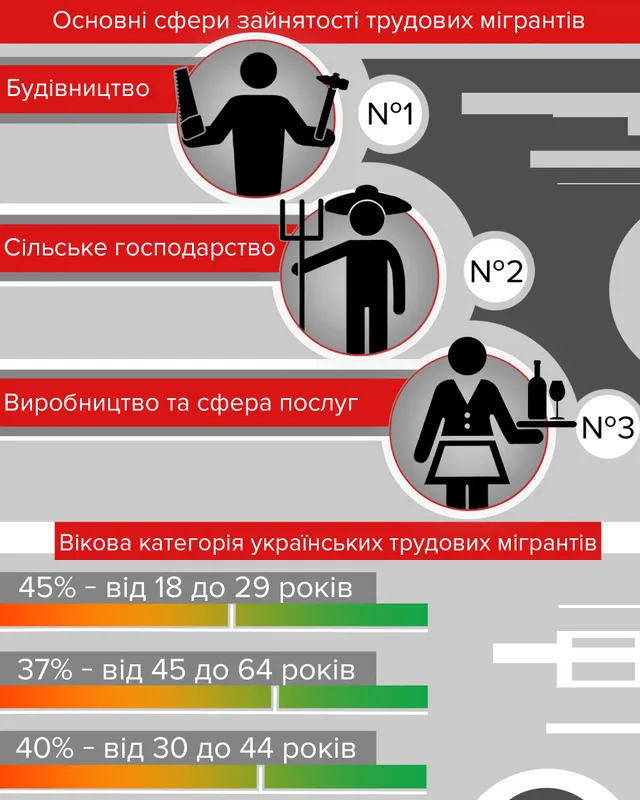 По данным МОМ, основной сферой занятости украинских трудовых мигрантов за рубежом является строительство, на втором месте сельское хозяйство, далее следуют производство и сфера услуг.