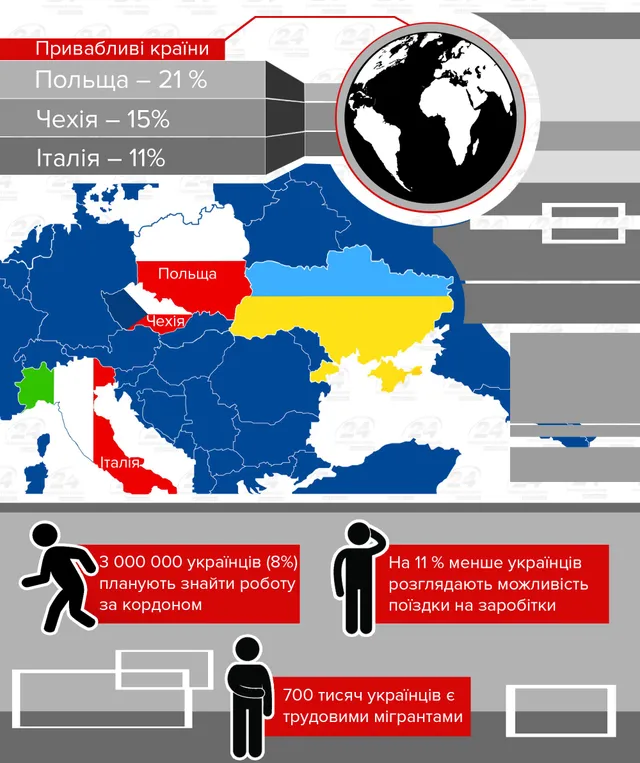 Привлекательными для украинских трудовых мигрантов чаще всего является Польша (21%), а также Чешская Республика (15%) и Италия (11%).