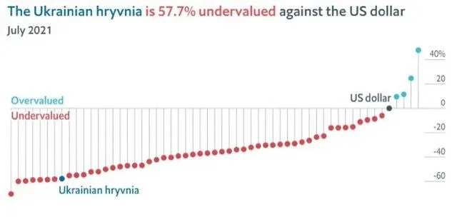 Разница между курсом в 11,5 гривны за доллар и фактическим обменным курсом, в 27,22 гривны за доллар, который приводит издание The Economist, изображает, что украинская гривна недооценена на 57,7%.
