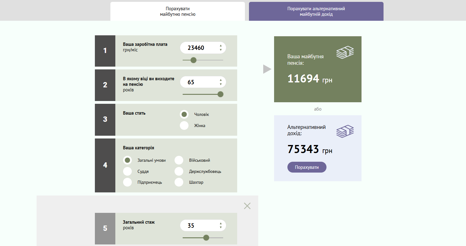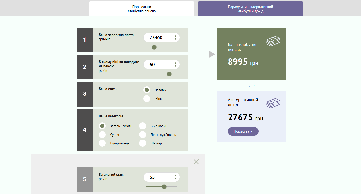 Какая будет пенсия со стажем 35 лет и зарплатой 23 460 гривен в 60 лет / Скриншот из пенсионного калькулятора