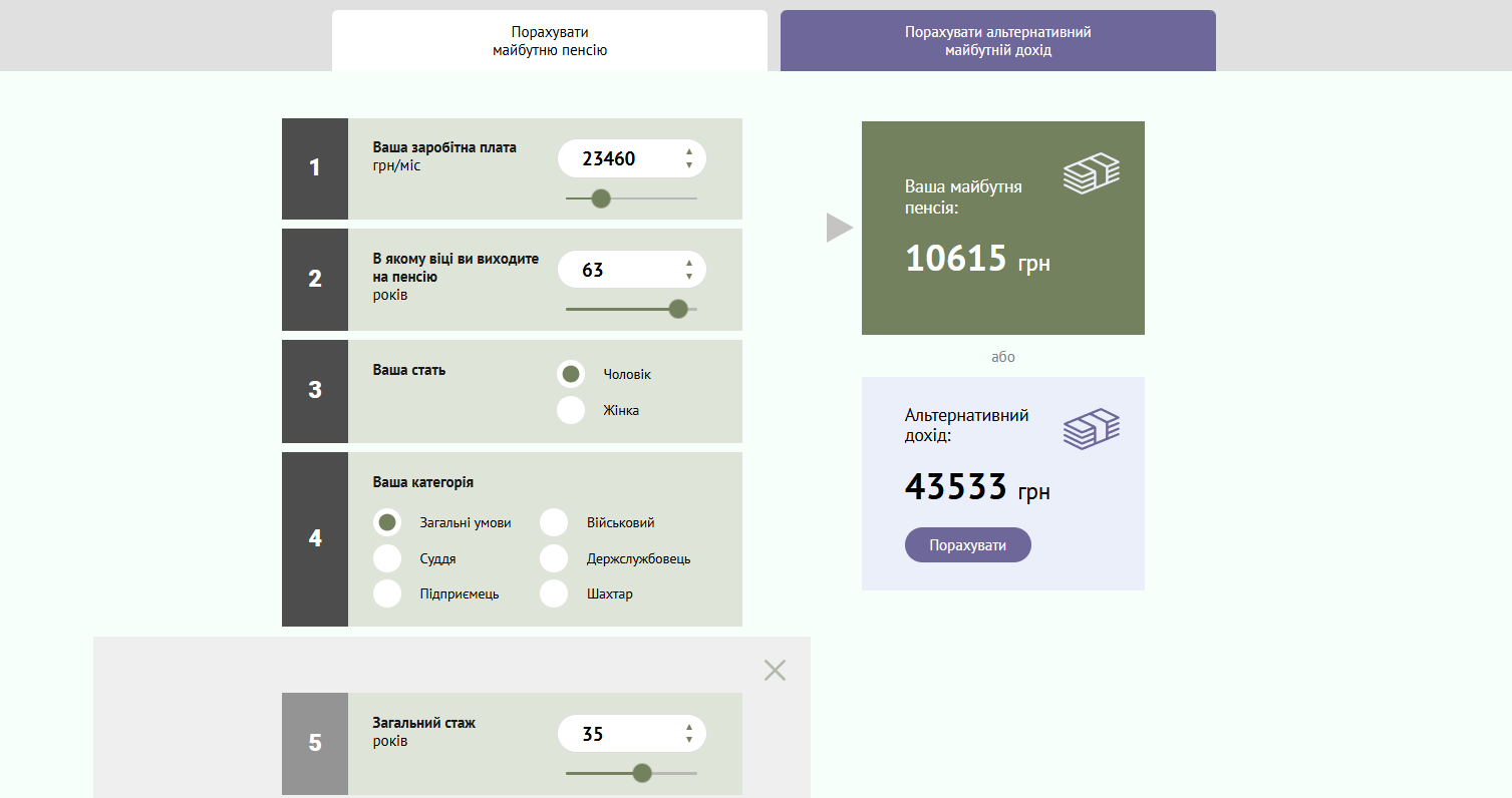Какая будет пенсия со стажем 35 лет и зарплатой 23 460 гривен в 63 года / Скриншот из пенсионного калькулятора